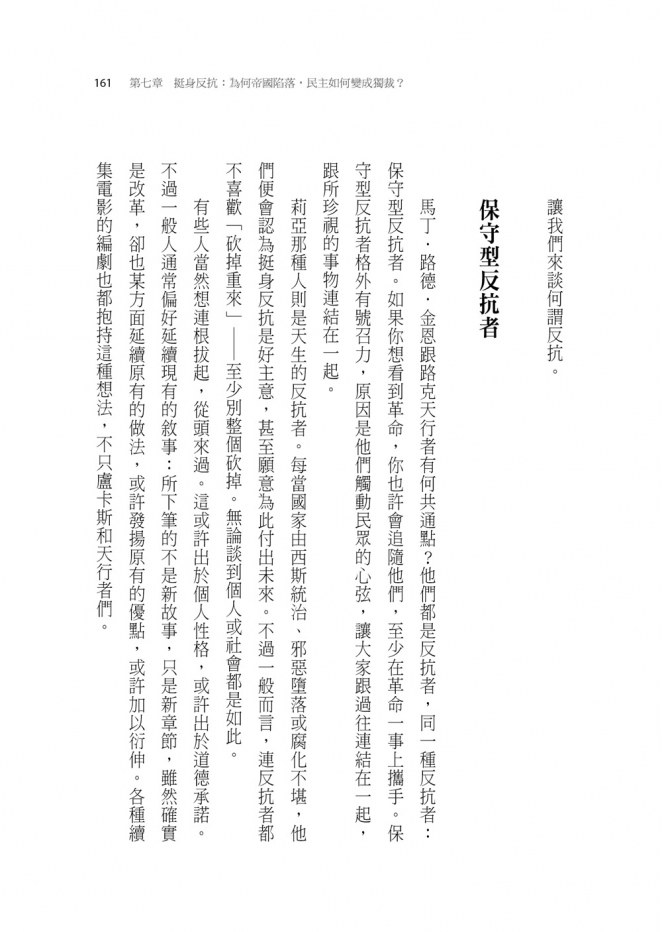 馬丁.路德.金恩跟路可天行者有何共通點?他們都是反抗者,同一種反抗者:保守型反抗者。如果你想看到革命,你也許會追隨他們,至少在革命一事上攜手。保守型反抗者可以格外有號召力,原因是他們觸動民眾的心弦,讓大家跟過往連結在一起,跟所珍視的事物連結在一起。
