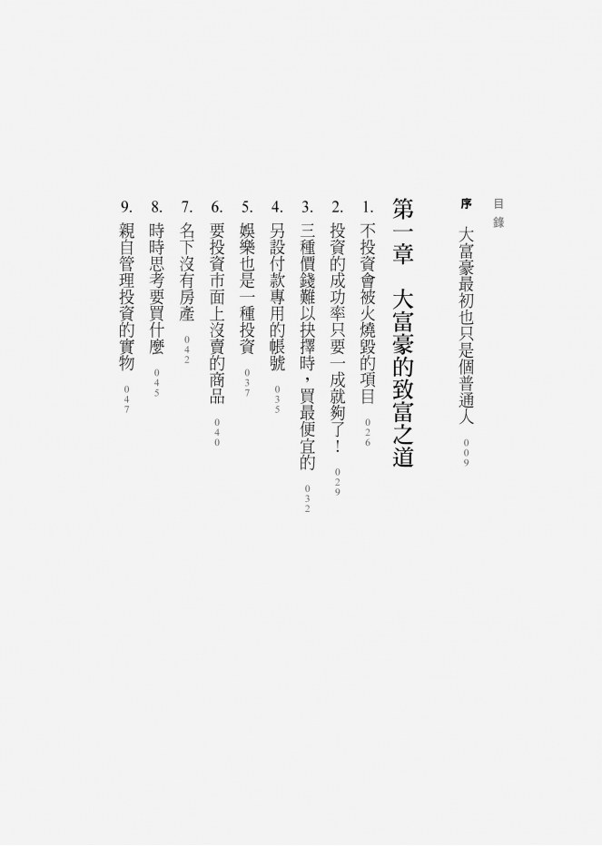 擺脫金錢的束縛,過著自在又豐富的人生才叫大富豪。投機小賺一筆,卻被金錢綁架,一切終將受金錢左右。好不容易賺了錢,卻未因此獲得快樂的人在這世上不計其數。我們最終希望得到的是快樂。大富豪懂得朝著快樂去營造增加財富的環境和狀態。 若能將這種態度的重要性和致富方法傳達給讀者,我將深感欣慰。
