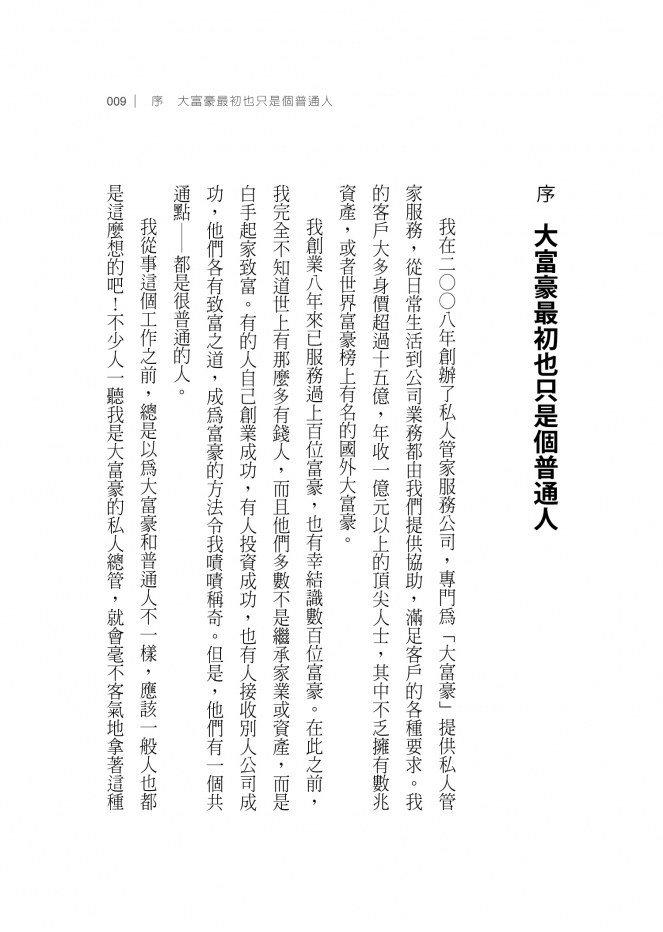 我在二○○八年創辦了私人管家服務公司,專門為「大富豪」提供私人管家服務,從日常生活到公司業務都由我們提供協助,滿足客戶的各種要求。我的客戶大多身價超過十五億,年收一億元以上的頂尖人士,其中不乏擁有數兆資產,或者世界富豪榜上有名的國外大富豪。
