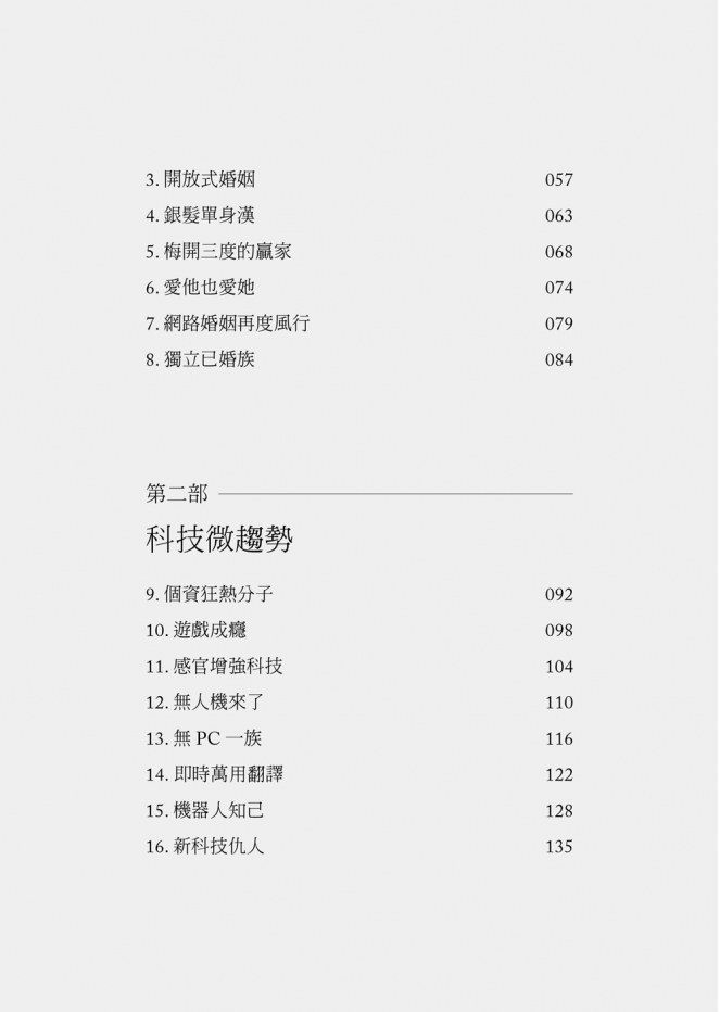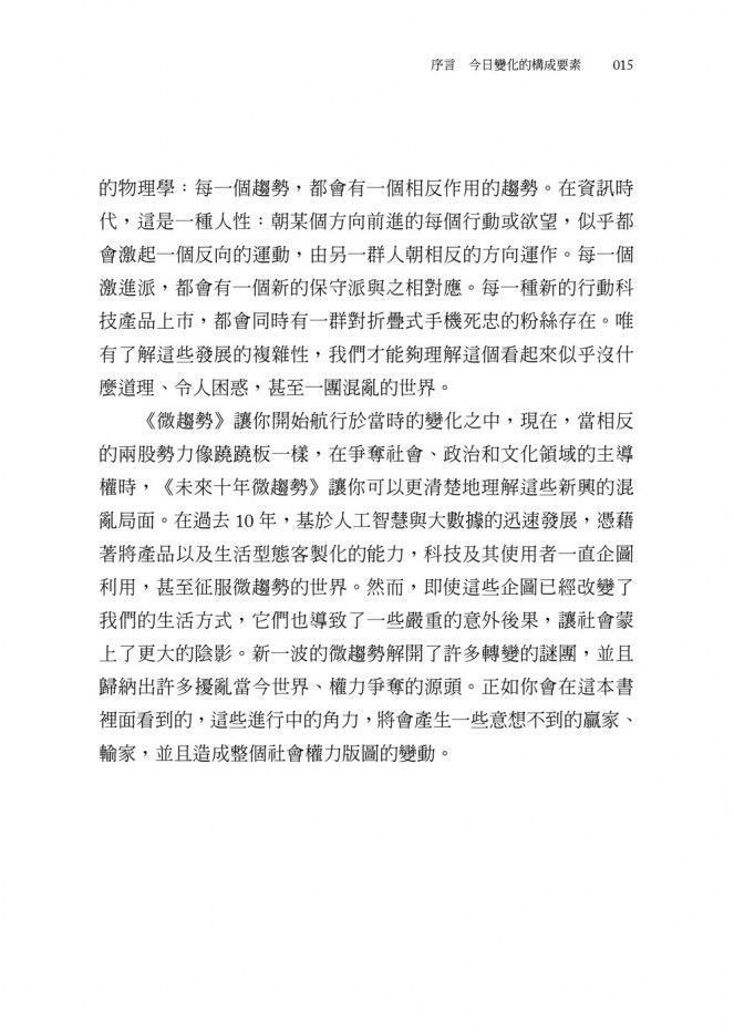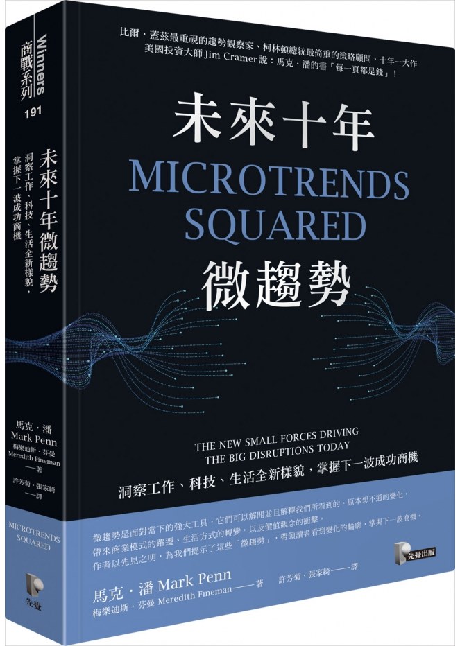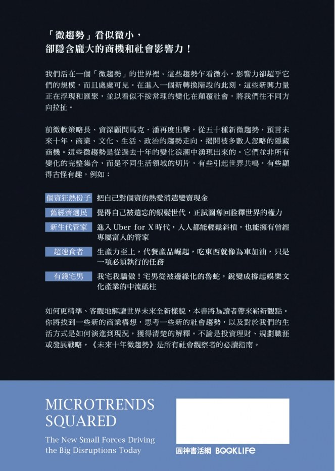 《微趨勢》讓你開始航行於當時的變化之中,現在,當相反的兩股勢力像蹺蹺板一樣,在爭奪社會、政治和文化領域的主導權時,《未來十年微趨勢》讓你可以更清楚地理解這些新興的混亂局面。在過去10年,基於人工智慧與大數據的迅速發展,憑藉著將產品以及生活型態客製化的能力,科技及其使用者一直企圖利用,甚至征服微趨勢的世界。然而,即使這些企圖已經改變了我們的生活方式,它們也導致了一些嚴重的意外後果,讓社會蒙上了更大的陰影。新一波的微趨勢解開了許多轉變的謎團,並且歸納出許多擾亂當今世界、權力爭奪的源頭。正如你會在這本書裡面看到的,這些進行中的角力,將會產生一些意想不到的贏家、輸家,並且造成整個社會權力版圖的變動。
