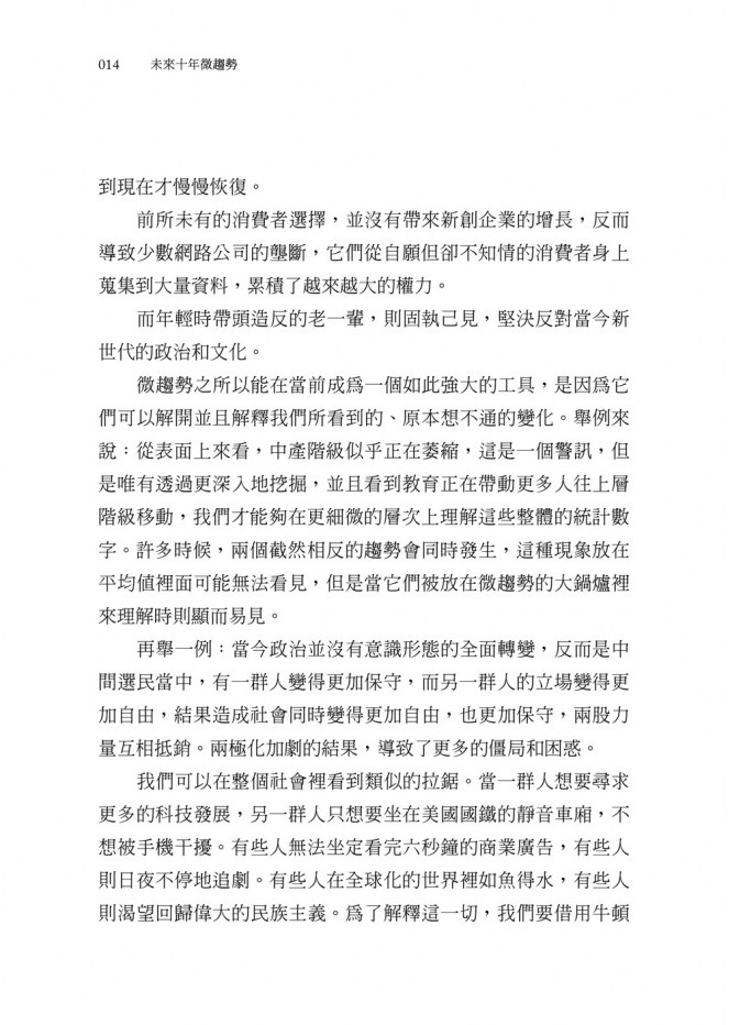 微趨勢之所以能在當前成為一個如此強大的工具,是因為它們可以解開並且解釋我們所看到的、原本想不通的變化。舉例來說:從表面上來看,中產階級似乎正在萎縮,這是一個警訊,但是唯有透過更深入地挖掘,並且看到教育正在帶動更多人往上層階級移動,我們才能夠在更細微的層次上理解這些整體的統計數字。許多時候,兩個截然相反的趨勢會同時發生,這種現象放在平均值裡面可能無法看見,但是當它們被放在微趨勢的大鍋爐裡來理解時則顯而易見。