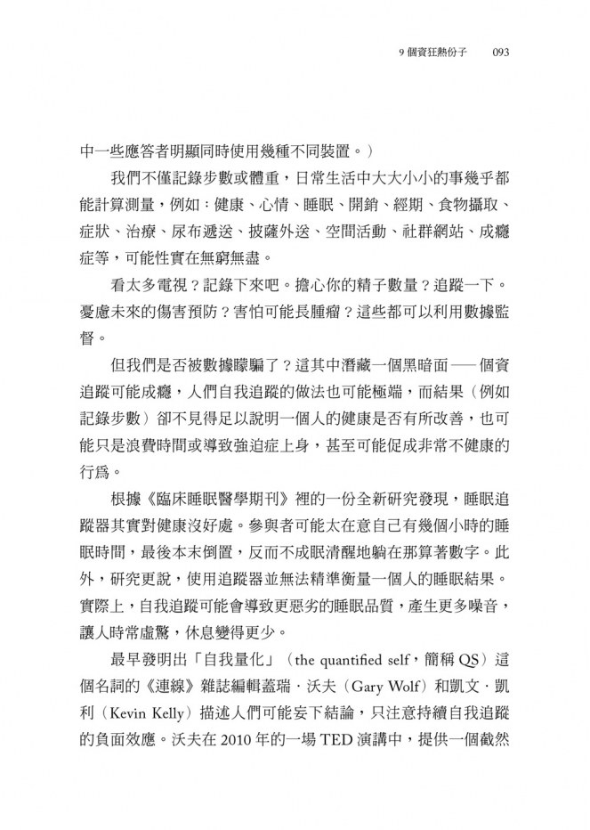 個資狂熱分子是新一代的華爾街交易員,展現另一種的資料上癮。當一個人的生活只圍繞著數據資料打轉,得到的數字便會讓他產生飛上天際或跌落谷底的想法,更有可能變成一種著迷。後來我才知道,原來塞德里不是唯一中了自我監督之癮的人。