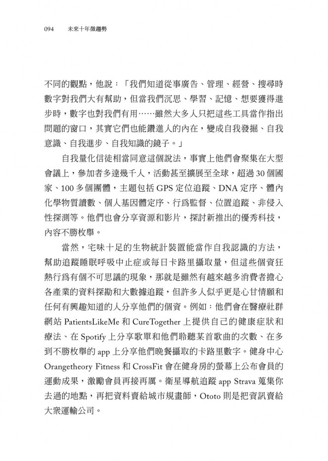 我們不僅記錄步數或體重,日常生活中大大小小的事幾乎都能計算測量,例如:健康、心情、睡眠、開銷、經期、食物攝取、症狀、治療、尿布遞送、披薩外送、空間活動、社群網站、成癮症等,可能性實在無窮無盡。