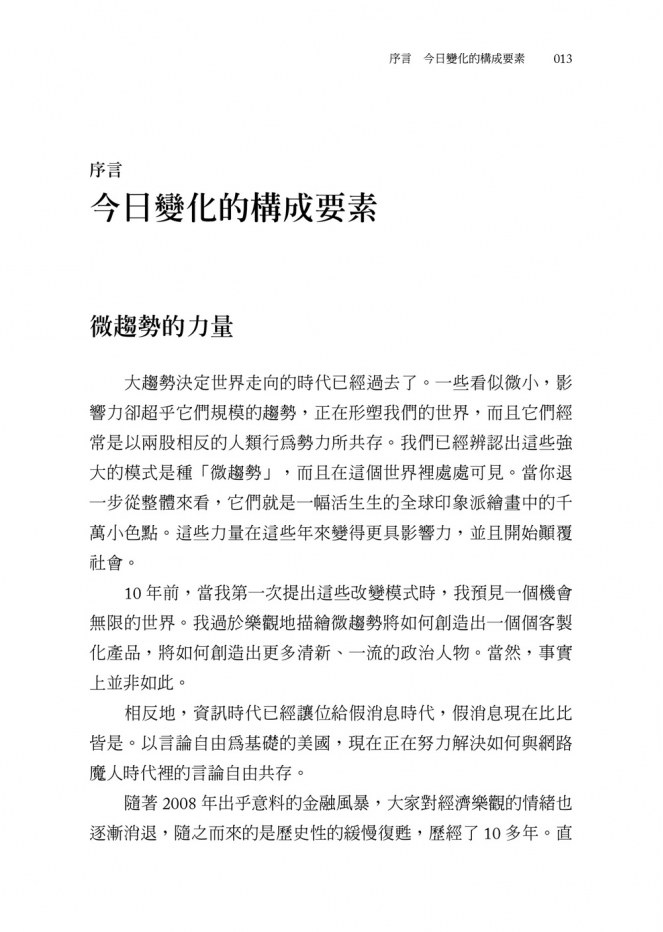 10年前,當我第一次提出這些改變模式時,我預見一個機會無限的世界。我過於樂觀地描繪微趨勢將如何創造出一個個客製化產品,將如何創造出更多清新、一流的政治人物。當然,事實上並非如此。