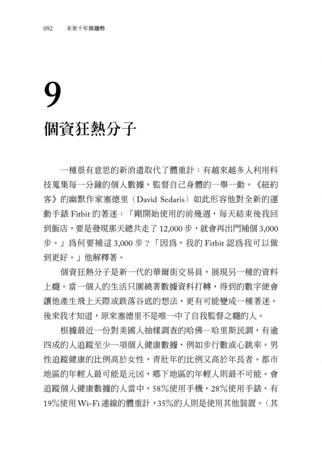 一種很有意思的新消遣取代了體重計:有越來越多人利用科技蒐集每一分鐘的個人數據,監督自己身體的一舉一動。《紐約客》的幽默作家塞德里(David Sedaris)如此形容他對全新的運動手錶Fitbit的著迷:「剛開始使用的前幾週,每天結束後我回到飯店,要是發現那天總共走了12,000步,就會再出門補個3,000步。」為何要補這3,000步?「因為,我的Fitbit認為我可以做到更好。」他解釋著。