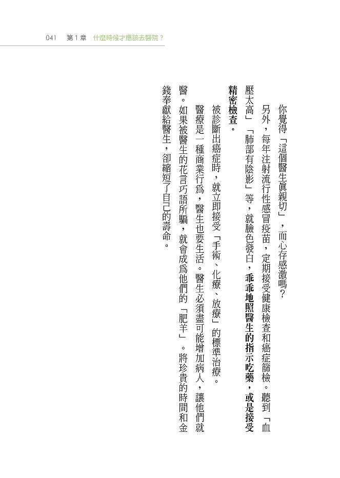 醫療是一種商業行為,醫生也要生活。醫生必須盡可能增加病人,讓他們就醫。如果被醫生的花言巧語所騙,就會成為他們的「肥羊」。將珍貴的時間和金錢奉獻給醫生,卻縮短了自己的壽命。