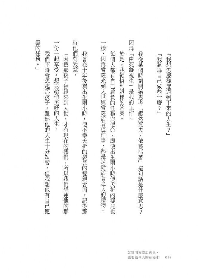 本書的書名《就算明天將說再見,也要給今天的花澆水》,這是我引用馬丁.路德(德國神學家、牧師)的名言,所改寫的話語處方箋,蘊含的意思如下: