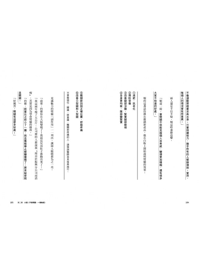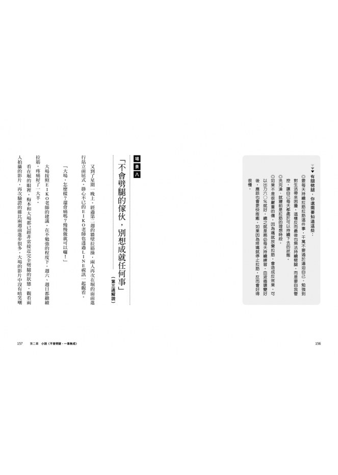 而劈腿拉筋也不是盲目的亂拉,是要靠技巧及正確的方式才能有效地執行並完成。而在這本書裡,就很詳細地告訴大家該怎麼做,並搭上時間的分配,輕易完成「劈腿」這個令大家害怕的動作。