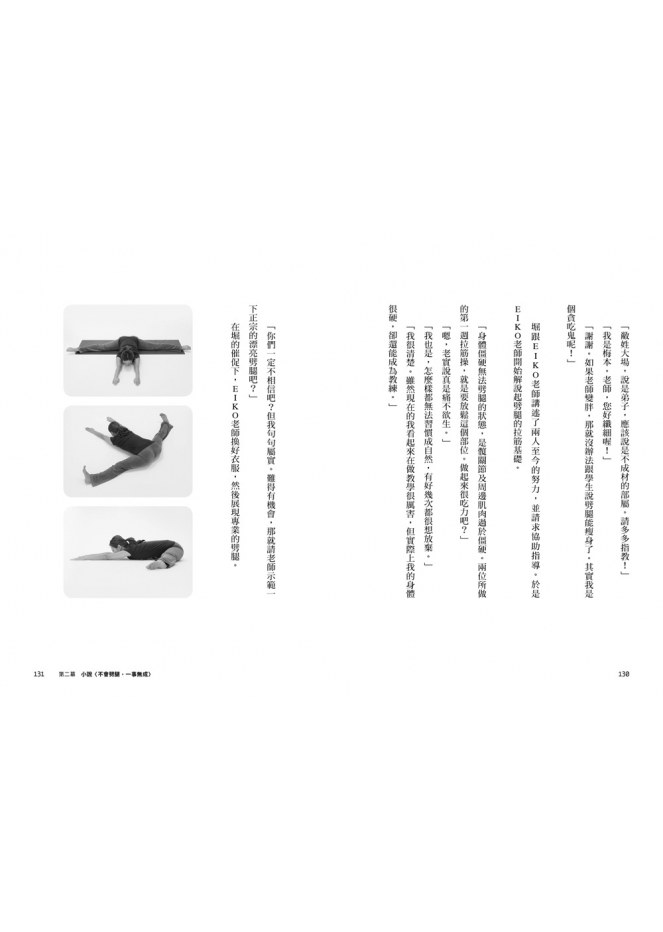 剛開始進行劈腿練習時,那種皮快被扒開、骨頭快斷掉的痛,現在想起來還會覺得疼痛…但一個月後,我的筋也因為每天含著眼淚練習而拉開了!只要大家照著這本書,用對方式一定可以輕鬆完成,好好的用「劈腿」與身體對話!