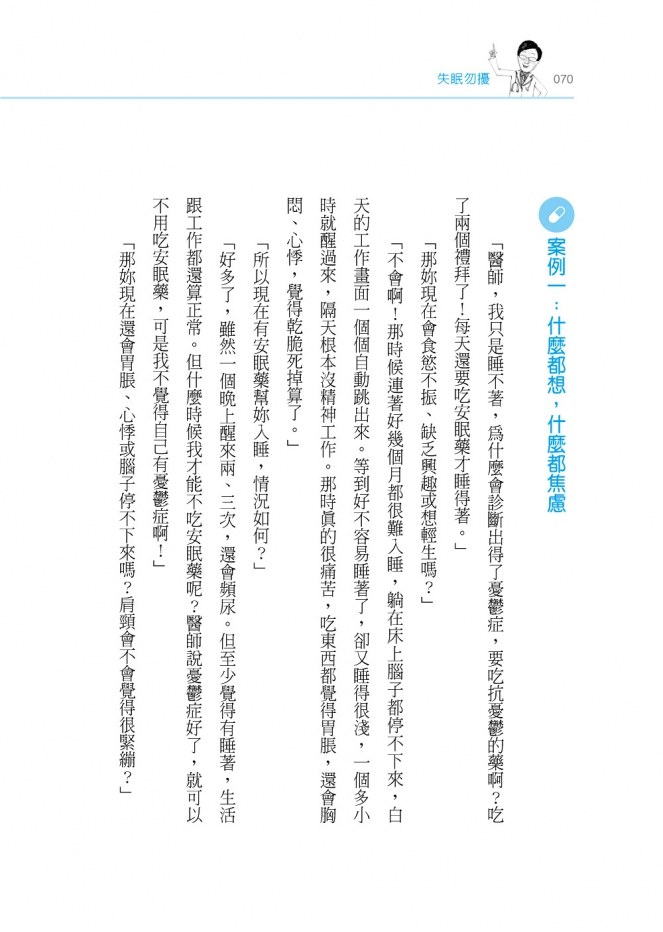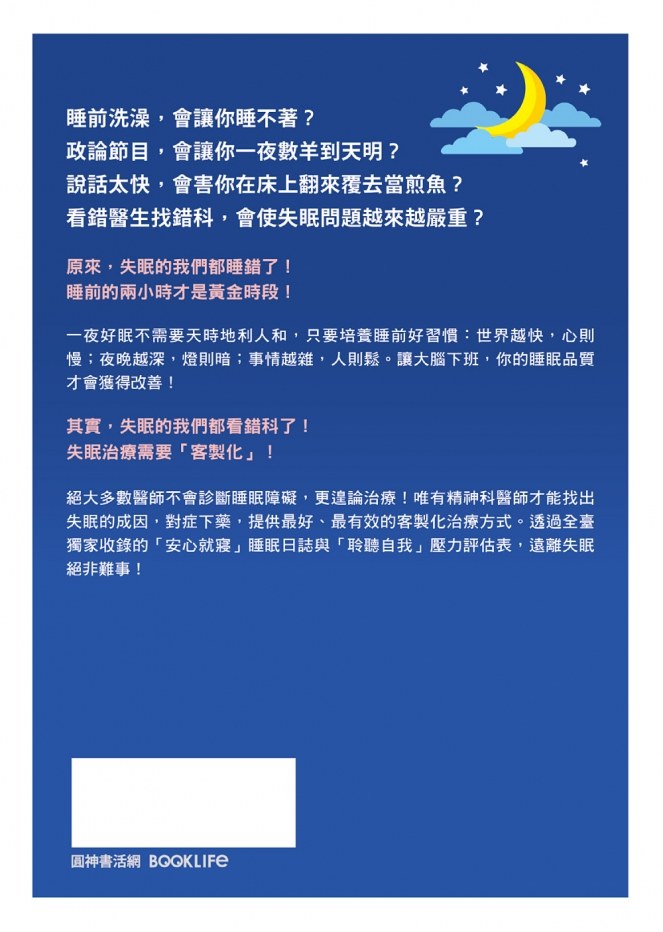 隨著精神醫學的進步,現在因失眠求診的病人,只要之前沒有習慣或長期使用安眠藥,透過正確的診斷、新的治療模式,有很高比例的病人真的可以遠離安眠藥。但是,這靠的不只是藥物治療,還需要學習睡眠方面的知識、改變工作與生活的習慣。希望減少使用安眠藥人口的同時,也必須讓服用安眠藥的人吃得安心,不要越吃越多。這本書正是希望達成這樣的目的。