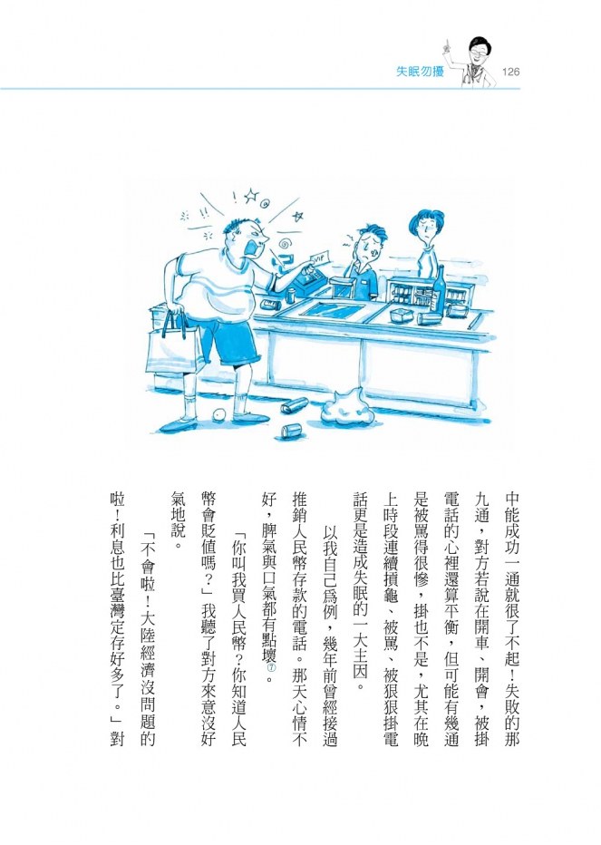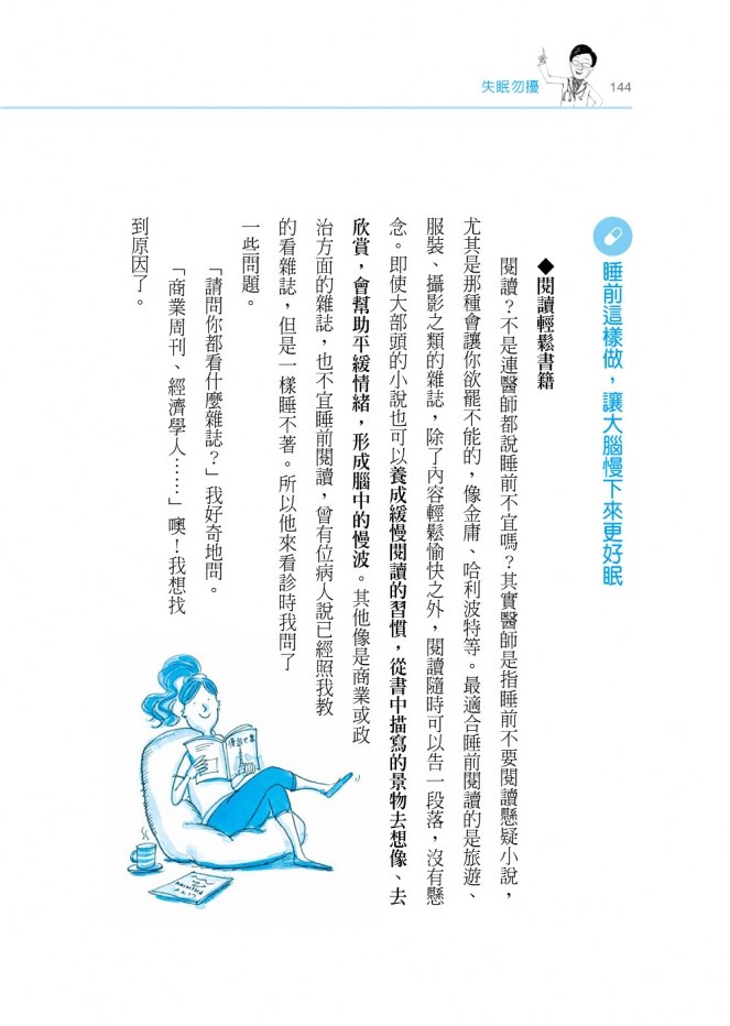 《失眠勿擾》就是一本提供大家正確觀念的好書,偉俐不僅把睡眠衛生的知識與技巧闡釋得非常清晰易懂,更重要的是,他把可能伴隨失眠的焦慮症、憂鬱症、物質使用疾患、自律神經失調或自主神經系統等疑問、一些專業術語、迷思與擔心,都做了很仔細的澄清。他鼓勵大家透過各種努力,如放鬆訓練、腹式呼吸、認知重塑、生活型態改變、規律運動等,期望讓非藥物處理失眠的方法發揮極致功能。即使非得要用藥,也要用得適切、用得安心。當然,在認真研讀本書之餘,若有任何疑義還是要尋求醫療專業人員的協助。