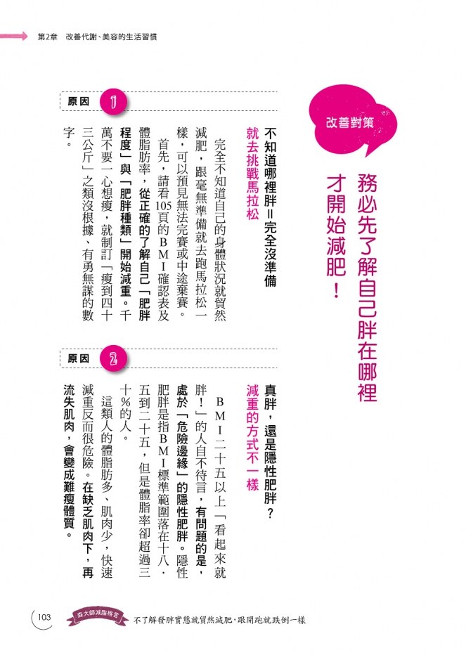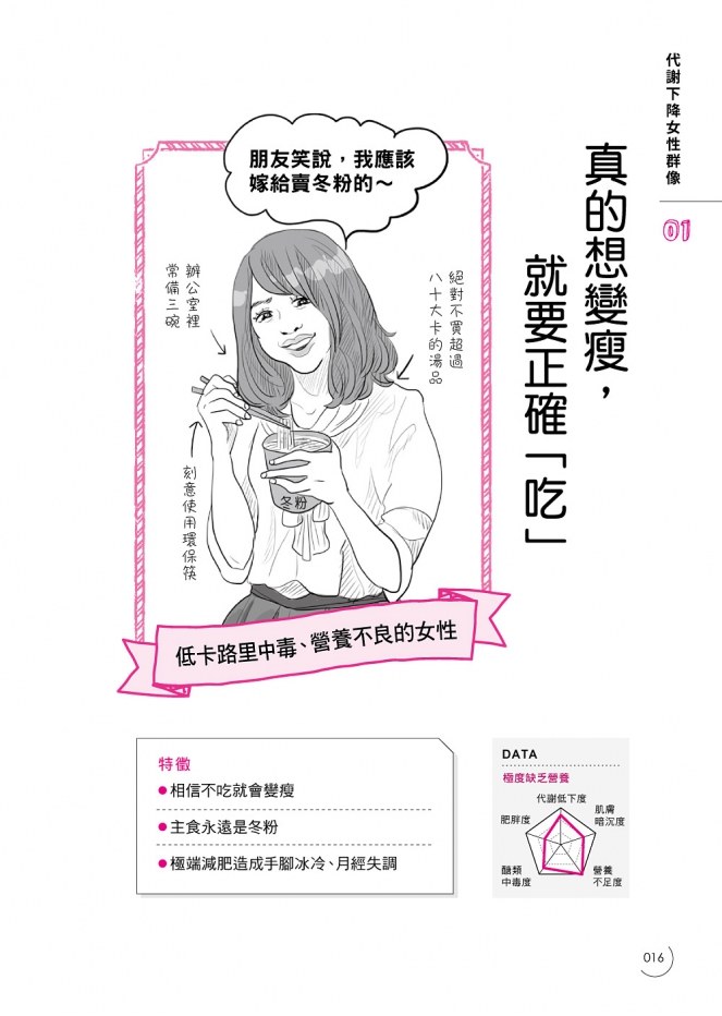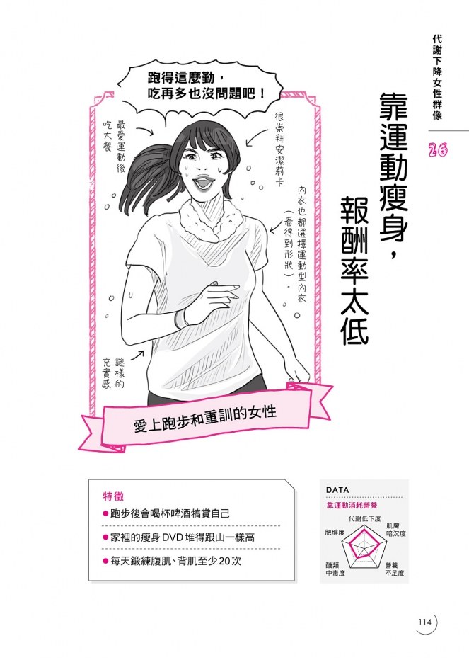 為了讓迷惘的減肥難民建立基本常識,本書特別設計成容易識別的群像特徵圖,彙整女性普遍容易搞錯的瘦身知識,並一一分析導正,提供能有效瘦身的正確知識和對策。記住: