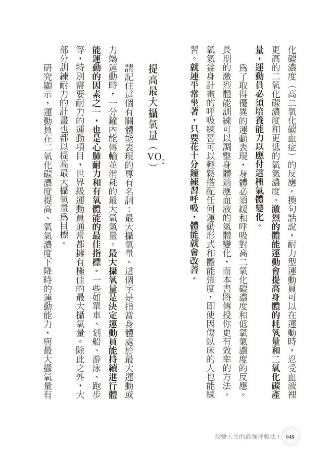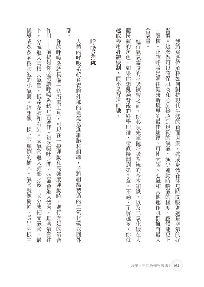 本書將帶你發現氧氣和人體的基本關係。改善身體的關鍵在於釋放更多氧氣給肌肉、器官和細胞組織。增加氧合作用不只能維持身體健康,從事高強度的運動時,呼吸也能更順暢。簡而言之,你的健康、體適能和運動表現都將一併提升。