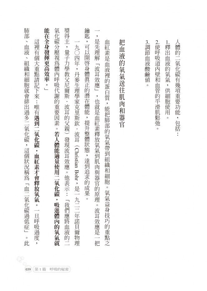 一百多年前,人們發現波耳效應可以解釋血液如何釋放氧氣到運作肌群和器官。大多數人不曉得,身體能使用的氧氣量原來是取決於血球細胞的二氧化碳含量。重點來了,我們的呼吸方式會決定血液的二氧化碳含量。只要正確呼吸,我們就能保有足夠的二氧化碳,讓呼吸呈安靜、受控、節奏穩定的狀態。如果過度呼吸,呼吸就會變得沉重、更緊繃又不穩定,而且肺部會排出太多二氧化碳,使身體更渴望吸到氧氣。
