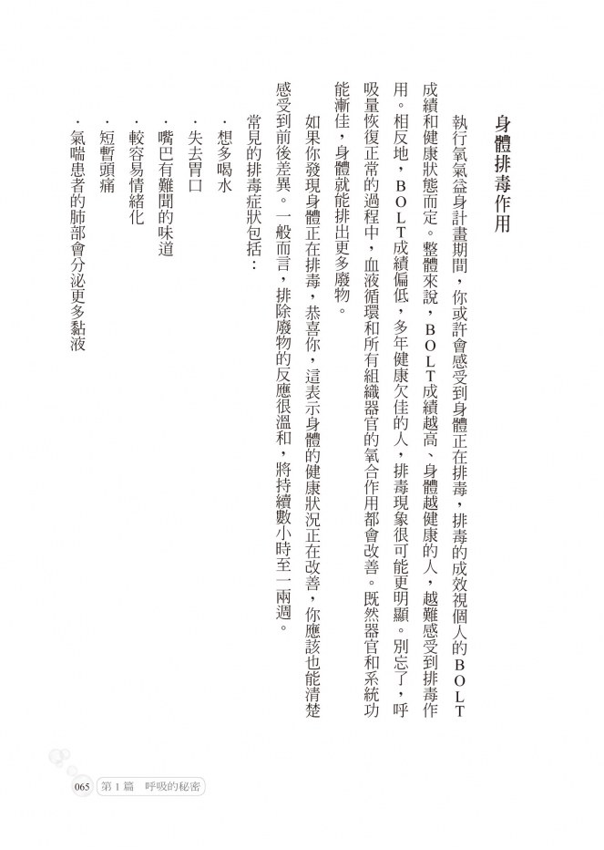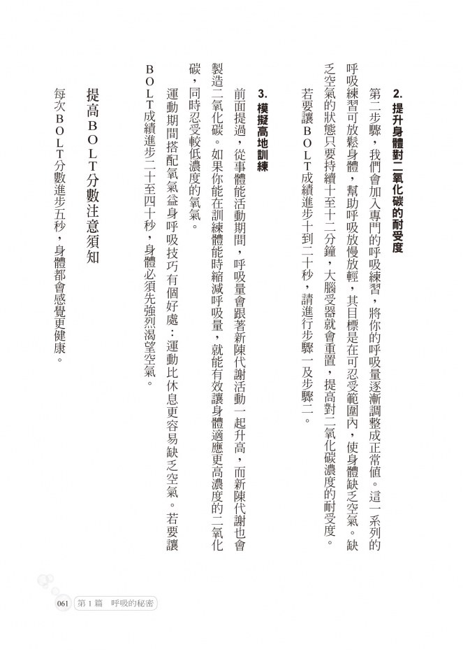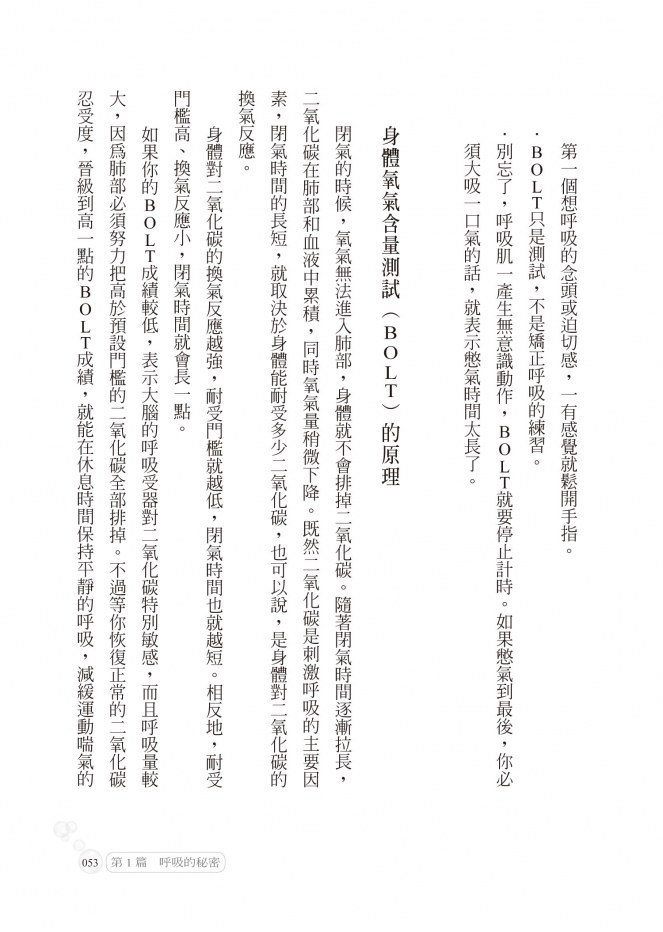 本書〈第1篇:呼吸的秘密〉將深入解釋氧氣和二氧化碳在體內的功能,幫助你評估自己的實際健康程度。你將學到鼻呼吸更勝口呼吸,以及能停止過度呼吸的關鍵技巧。另外,古代盛行數世紀的呼吸訣竅也會在本篇的最後章節揭曉。