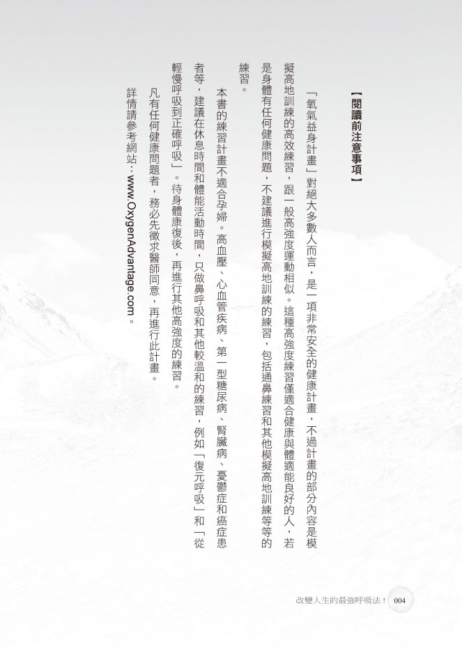 本書詳實介紹的「氧氣益身計畫」,是我和大衛、道格、唐娜及其他數千人的合作成果。不論運動量多寡,氧氣益身計畫都能讓人獲得力量,即使不加強訓練,不服用藥物或營養補給,也能改善健康、體能和運動表現。各位還能學習如何輕鬆準確地衡量進步的幅度,以及如何安全地練習呼吸,減少受傷風險。最後,不論你是誰,過著什麼樣的生活,氧氣益身計畫都能與你的日常生活與運動習慣融合一體。