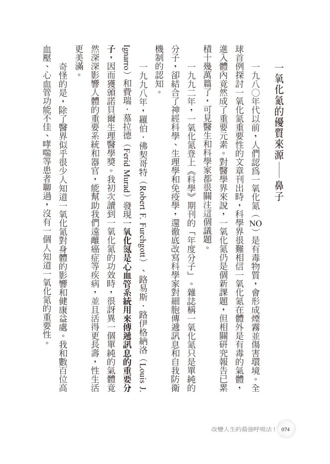 ◎我患有過敏性鼻炎,因此都用嘴巴呼吸,自從讀了這本書後,有意識地改為用鼻子呼吸,沒想到變得很輕鬆,鼻炎症狀也舒緩了。書中提到,鼻子是用來呼吸的器官,嘴巴則是用來進食的,真是深獲我心。
