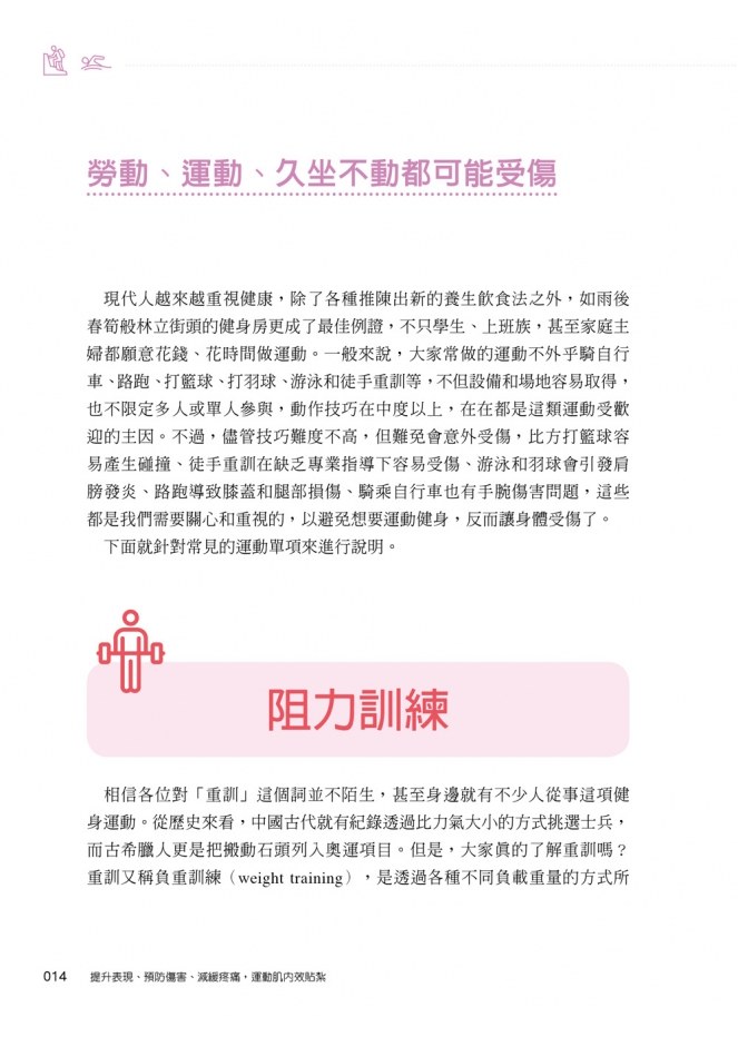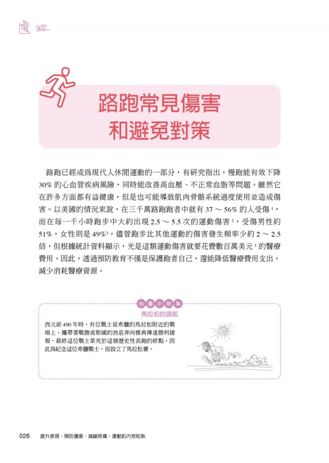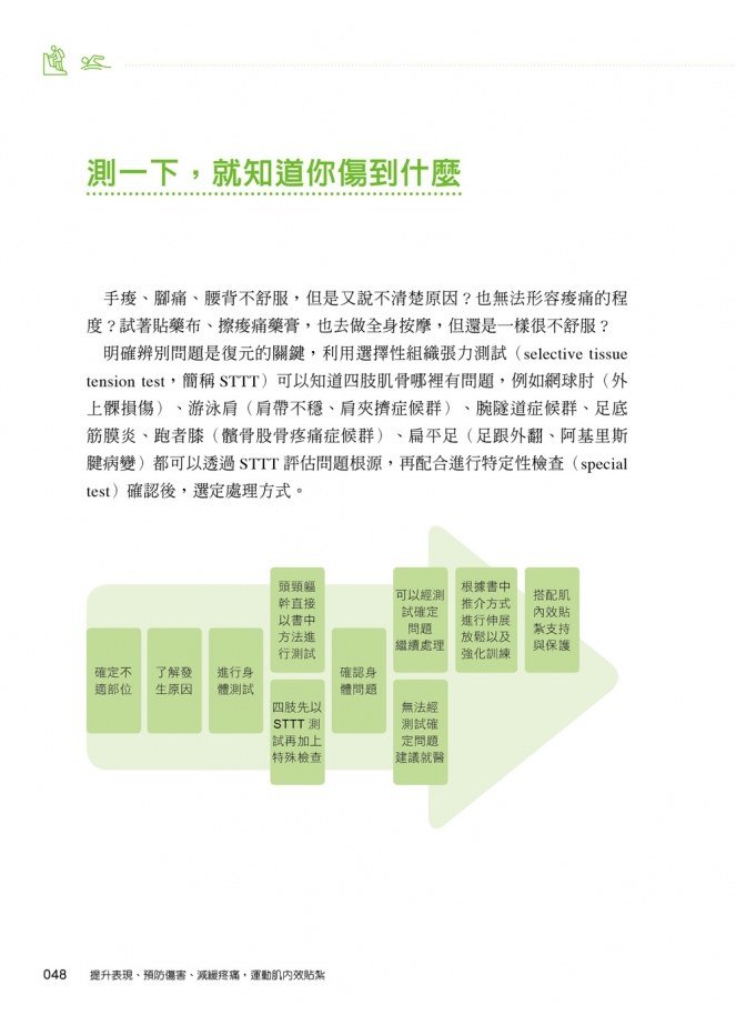 本書雖然是從運動出發,但不僅限於運動員參考。Chapter1說明常見的運動以及可能發生的肌骨問題,Chapter2則從身體部位的不適切入,學習者可根據本書內容自我檢測或請旁人協助檢測,確認肌骨問題並加以處理,最後再對應Chapter3的肌內效貼紮方法,適切地保護和支撐受傷的肌骨,以減少疼痛和輔助肌骨發揮正常機能。因此,本書可以說不只是運動愛好者的參考書,同時也是累積家務、勞務傷害的人,以及白領上班族有效消除肌骨痠痛傷的極佳參考書。有了這本書,再帶上肌內效貼布、準備一些伸展放鬆或訓練的工具,一步一步找出自己的問題並加以解決,任何人都可以擁有開心無痛的肌骨健康人生。