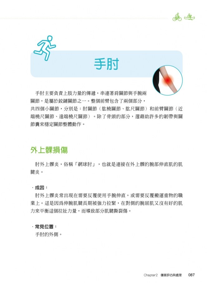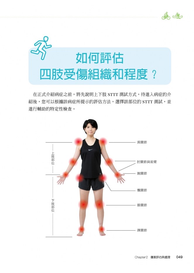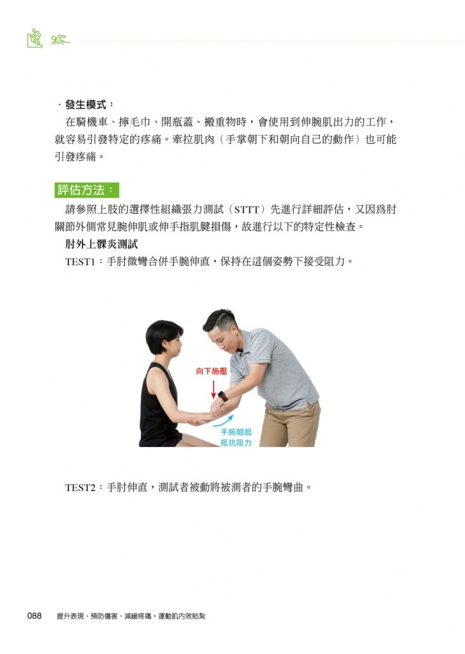 接著Chapter 2進入本書的重頭戲:選擇性組織張力測試和各種運動傷害的特殊檢查。作者在Chapter 2一開始說明了四肢肌骨檢查方法,可以透過檢查方式找到身體的收縮性組織(肌肉為主)或非收縮性組織(韌帶、關節囊等)的損傷問題,再搭配特殊檢查可以更加確定病症,就能對這些組織進行放鬆或強化的動作,因為測試方式直接對應肌肉骨骼系統及其常見運動傷害病症,在操作上就顯得簡單輕鬆,適合各種不同的族群閱讀,不會艱澀困難。更棒的是,本書還分享了一些常見特殊檢查的測試流程影片,只要掃瞄QR Code,就能連結到示範影片,幫助大家輕鬆了解測試動作的重點,您一定要試一試!