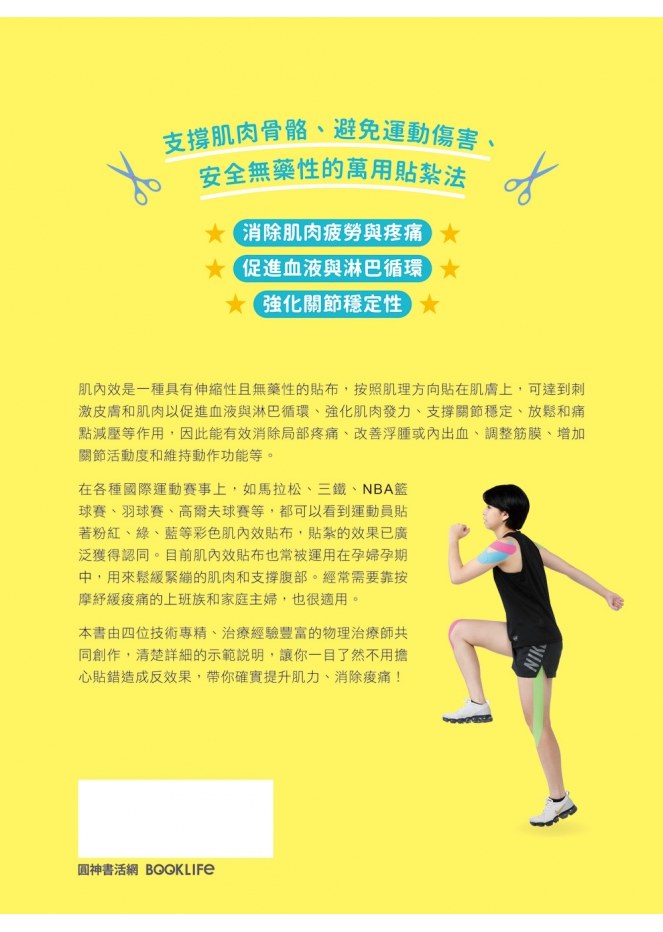 本書由四位技術專精、治療經驗豐富的物理治療師共同創作,清楚詳細的示範說明,讓你一目了然,不用擔心貼錯造成反效果,帶你確實提升肌力,消除痠痛!