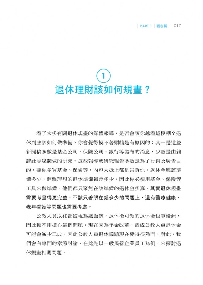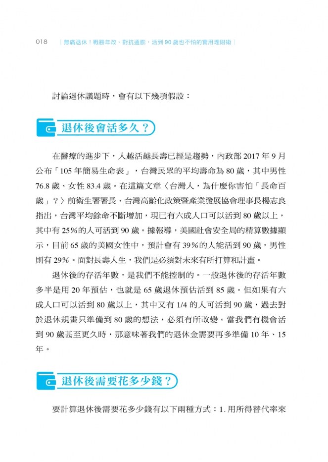 談到退休,你會有什麼感覺:信心滿滿、焦慮,還是茫然沒有頭緒?2018年又是多事之秋:軍公教人員年金改革出爐,多數人的退休金大概少3成以上。也許本來預期退休金每月有6萬的,現在變成4萬,這些少掉的退休金要從哪裡補回來,才不會影響退休生活?而且勞保年金也要開始討論如何改了,這些事對所有人來說,可能都不是一件值得高興的事,因為大家的退休金都要減少了。身為一個獨立財務顧問,在幫客戶提供財務規畫諮詢的時候,退休規畫一向是我會跟他們討論的重點項目之一。對於退休規畫這件事,多數人是沒有概念的:退休該做何準備?退休後沒有工作收入,生活費要從哪裡來?退休只有錢的問題需要準備嗎?多數人從媒體接觸到的退休相關資訊,多半只是很粗淺的:專家說,退休需要準備1,500萬元、2,000萬元,甚至更多。但這些數據怎麼算出來的?每個人對退休的需求不同,你該怎麼評估自己退休到底需要什麼?現在醫療進步,如果65歲退休後還有30年、40年的時間要過,你要如何規畫?這些考慮都指向一件事情:退休是一件需要全盤考量的事,不只是錢的問題而已,還有家庭、健康……等因素。