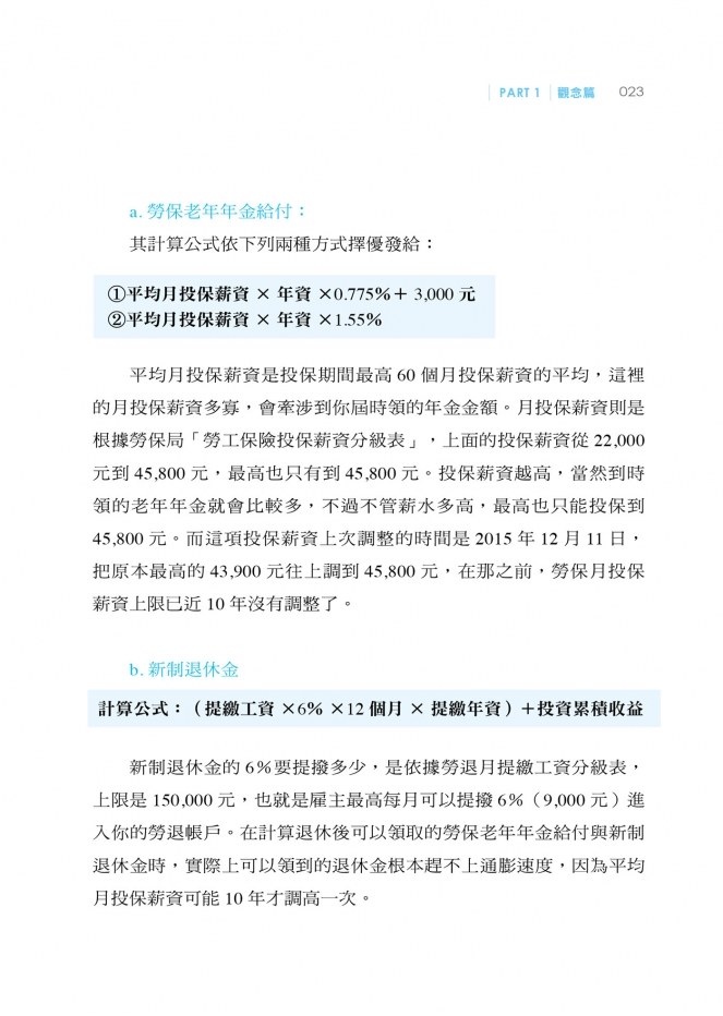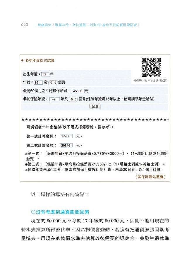 書中可貴的部分,在於2018年公務人員調薪3%,震宇兄也針對調薪後公務人員年改退休金的計算舉實例說明。作者曾受邀於勞動部演講,其主題就是「公務人員年金改革下的退休規畫」,公務人員對於年改的內涵,有高度的動機想要了解,也期待本書能夠有效幫助公務人員做好退休規畫。