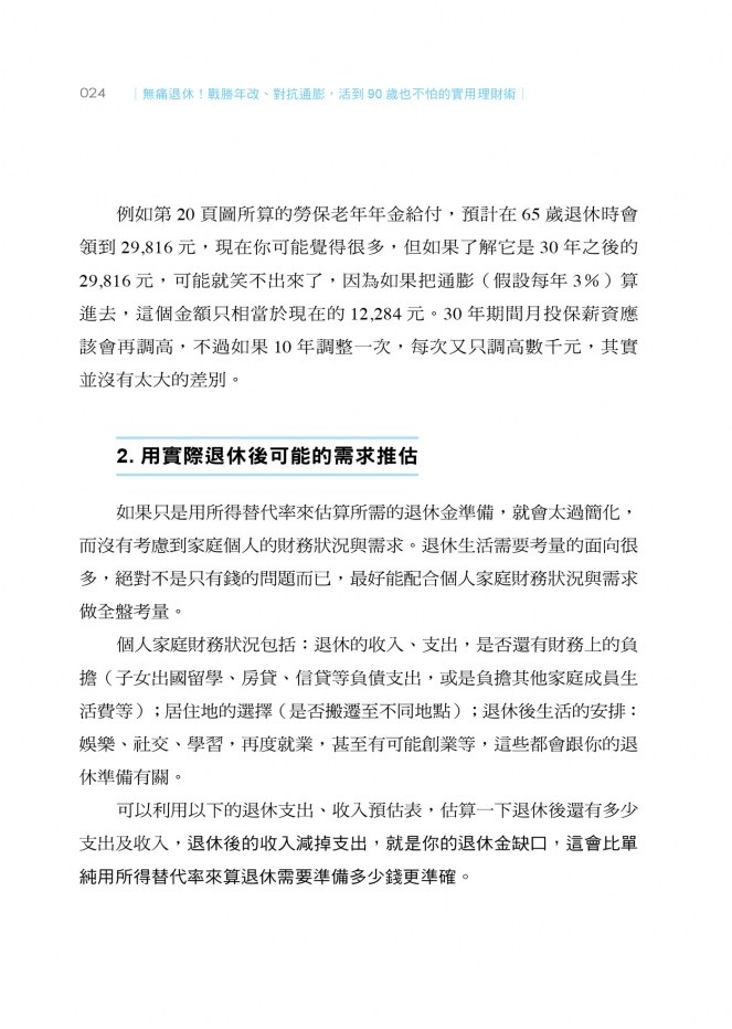 退休要考慮的因素繁多,並不像網路上的退休試算那麼簡單,只要輸入預估的退休後餘命年數、每月生活費、醫療保健費用、通膨率、資產報酬率……等,就可以算出你的退休財務需求。作者從觀念引導讀者做退休規畫要注意的事項和建議,以家庭經濟為核心做準備,從四個面向:財務、健康、生活型態與社會心理,逐一檢視,才不會顧此失彼,並以實際案例說明,以適當投資工具建構完整的退休規畫。