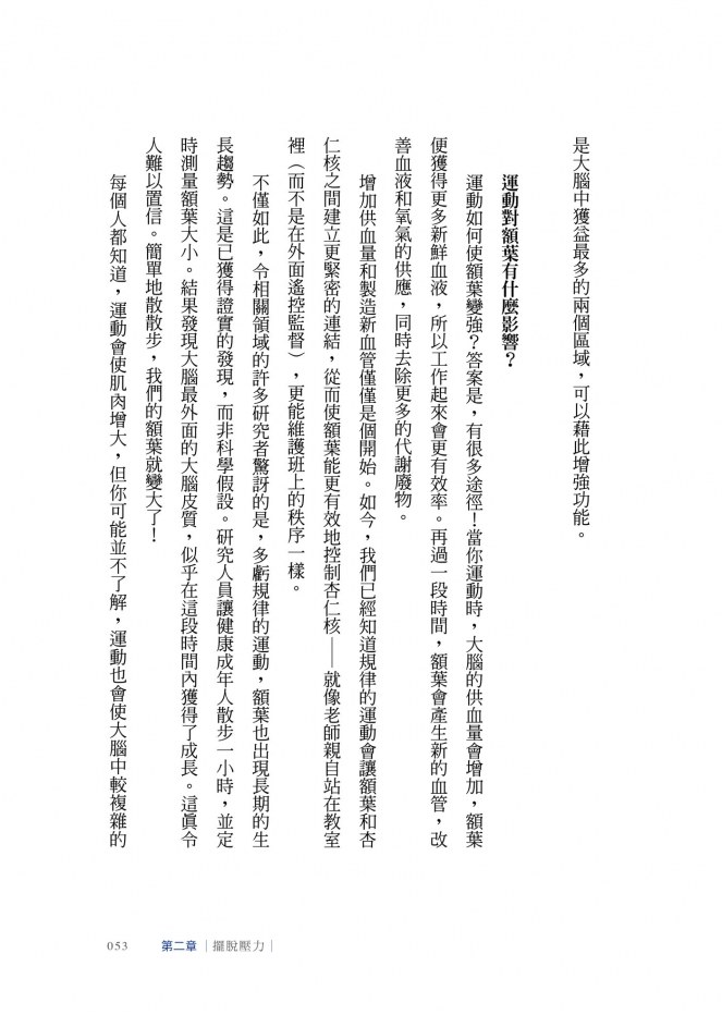 在本書中,我將向你介紹「運動」和「科學訓練」對大腦產生的巨大影響,以及其中的機制。有些成果是立竿見影的,甚至在散步或跑步一次後就會顯現,有些則至少需要規律地訓練一年才能看到。在本書中,我還會為你描述運動在健身和心理方面帶來的益處,這些甚至不亞於精神的昇華。