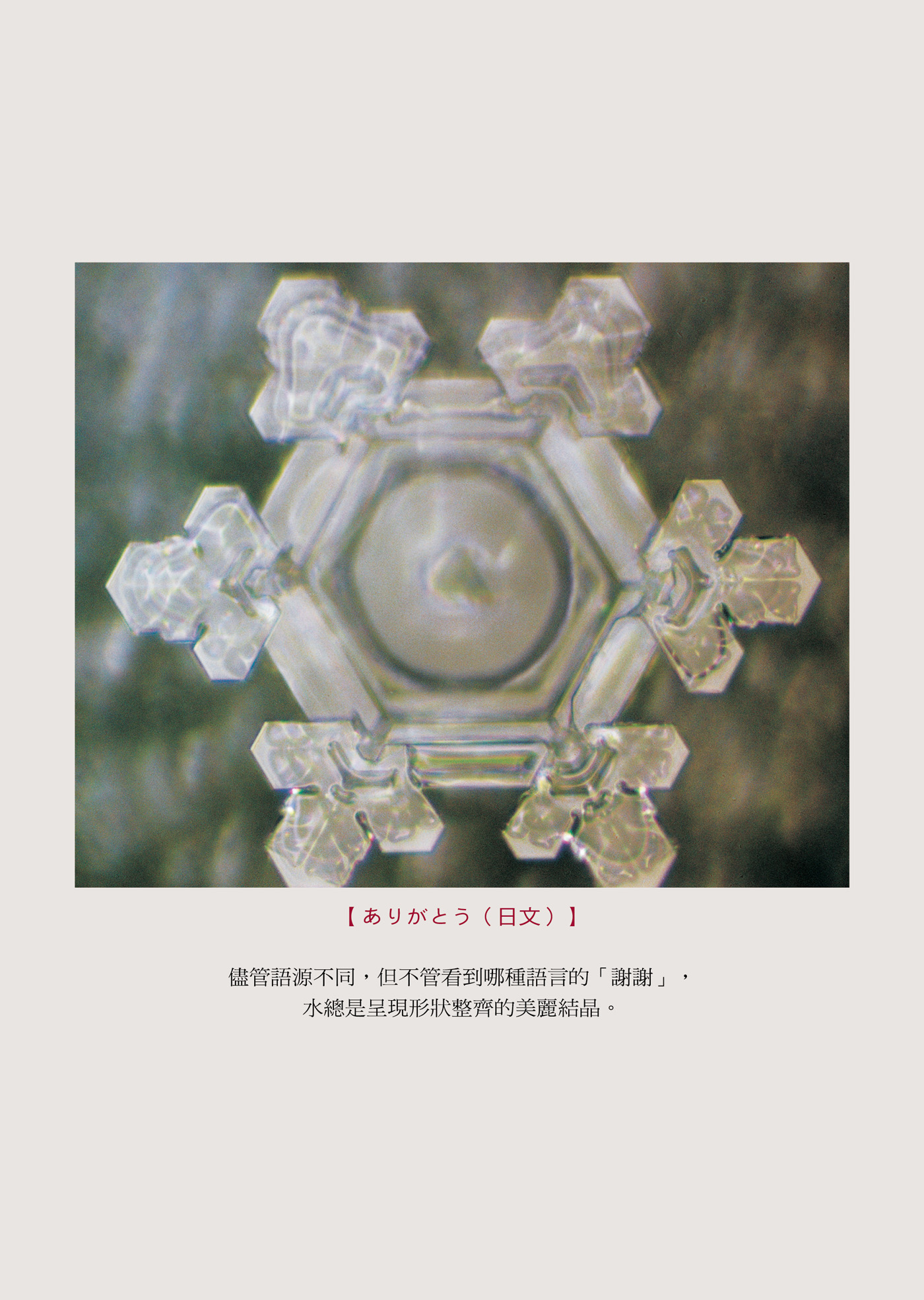 透過水結晶呈現的樣態,我們可以清楚的看到讚美跟責備的語言,如何影響我們的情緒波動──因為,人就是水。