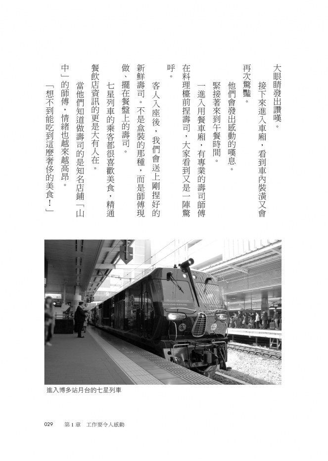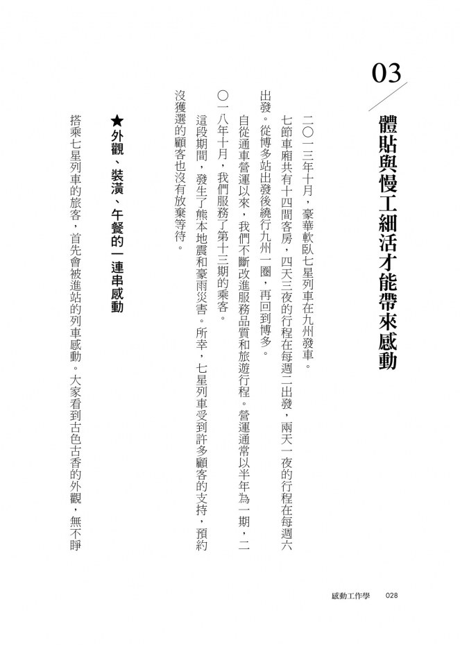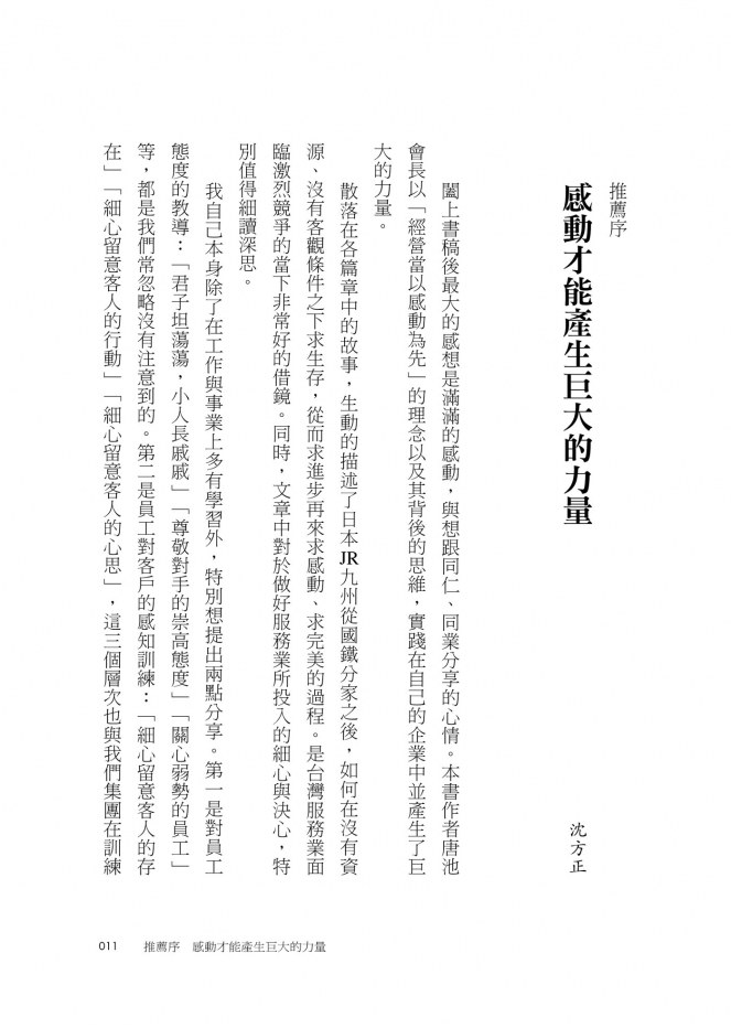 散落在各篇章中的故事,生動的描述了日本JR九州從國鐵分家之後,如何在沒有資源、沒有客觀條件之下求生存,從而求進步再來求感動、求完美的過程。是台灣服務業面臨激烈競爭的當下非常好的借鏡。同時,文章中對於做好服務業所投入的細心與決心,特別值得細讀深思。