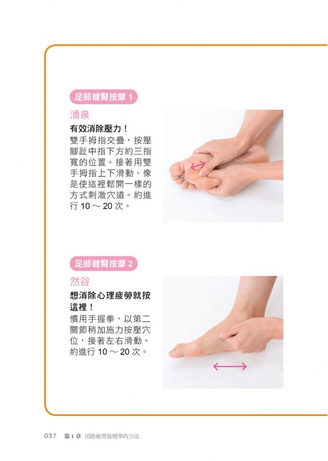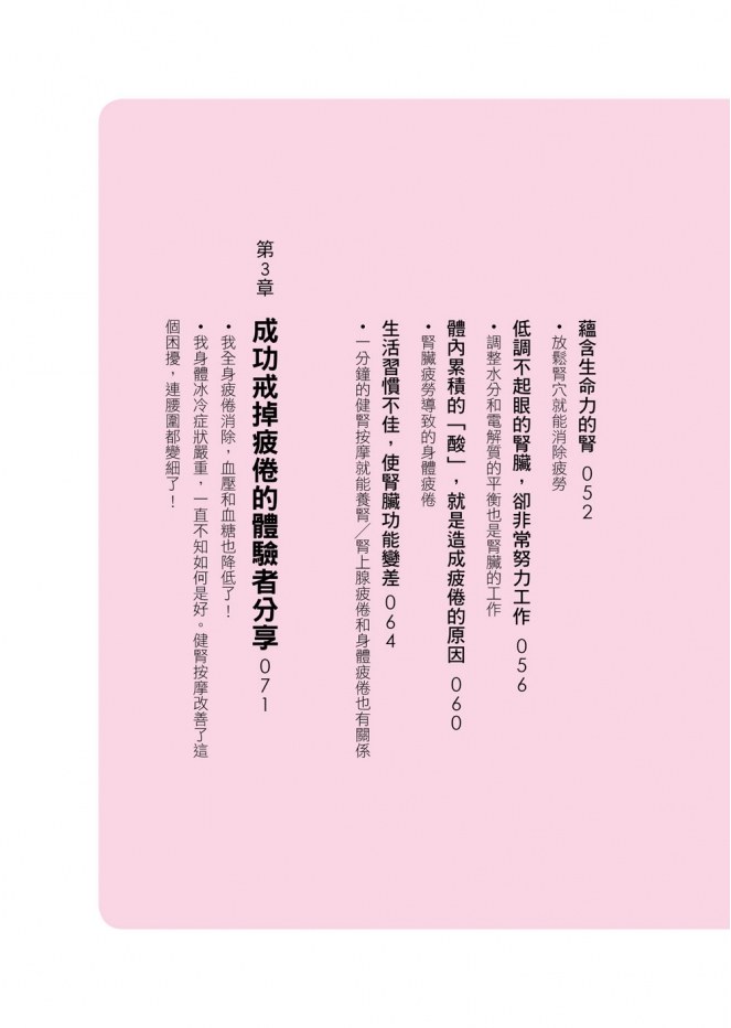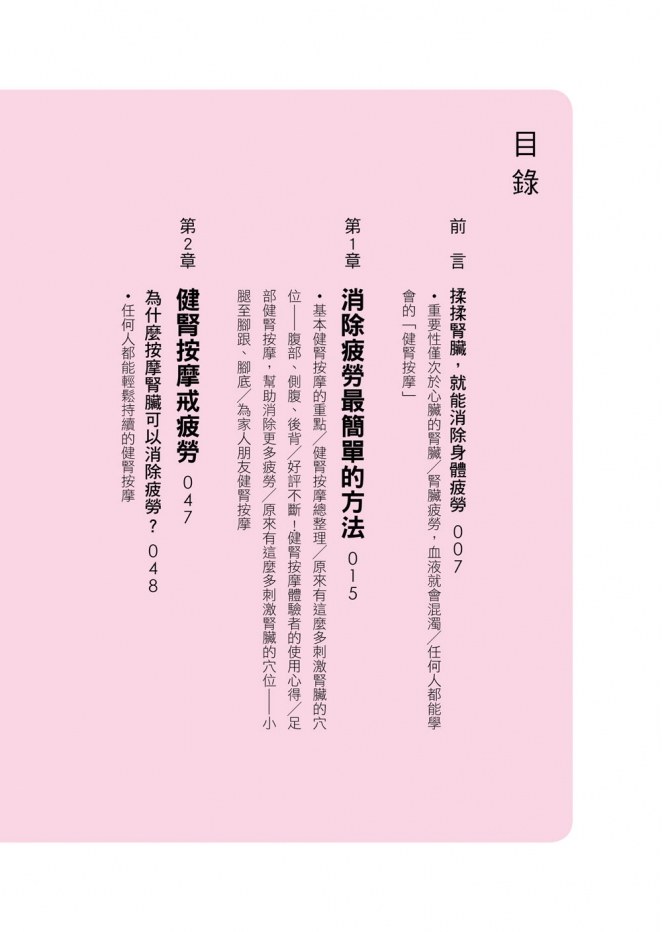 ‧基本健腎按摩的重點/健腎按摩總整理/原來有這麼多刺激腎臟的穴位/好評不斷!健腎按摩體驗者的使用心得/足部健腎按摩,幫助消除更多疲勞/為家人朋友健腎按摩