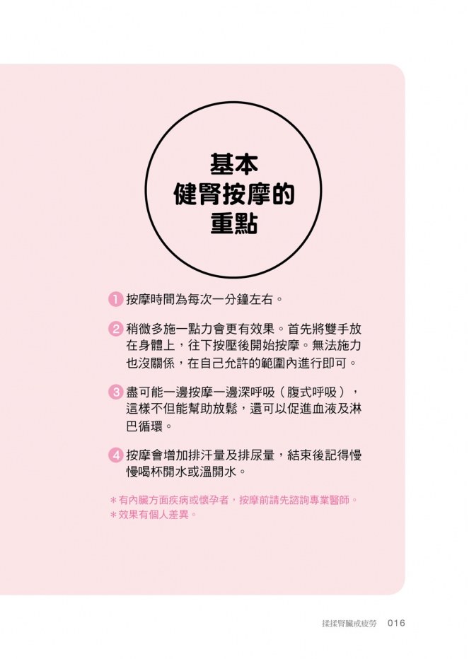 接下來的應用篇,還會介紹足部的健腎按摩,和幫別人按摩的方法,建議大家依序先從基本的健腎按摩開始做起。