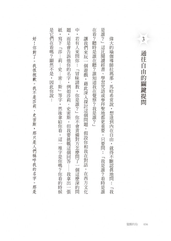 但在你興奮過頭或打退堂鼓之前,得先澄清一件事:你對事情的看法與意見並不是我們要的。此外,我們對你讀過的書、上過的課或參加過的專題討論都不感興趣,只關心你親身經歷的直覺體驗。我們不要你的知識,而是要你的直接經驗。沒錯,在這件事情上,你不會失敗,因為你的「自我」就是不折不扣的你,在一切時間空間的那個你。我們只須把它挑出來,畢竟,混在裡頭容易令人困惑。