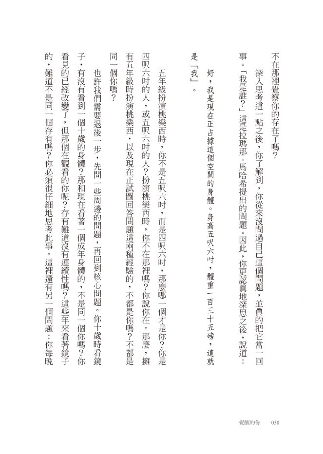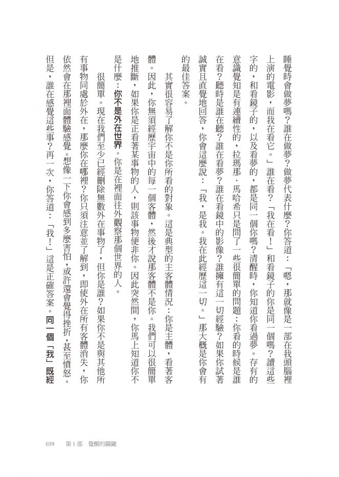 在接下來的章節中,將進行一段探索「自我」的旅程,但不以傳統的方式進行。既不求教於心理學家,也不理會哲學家;不會在古老的宗教觀點中爭論及選擇,或是訴諸民意調查的統計支持。我們會轉向對研究主體有具體直接認識的單一來源,求助一位在生命的每時每刻都在收集能解決此一大哉問必要資料的專家。那位專家就是你。