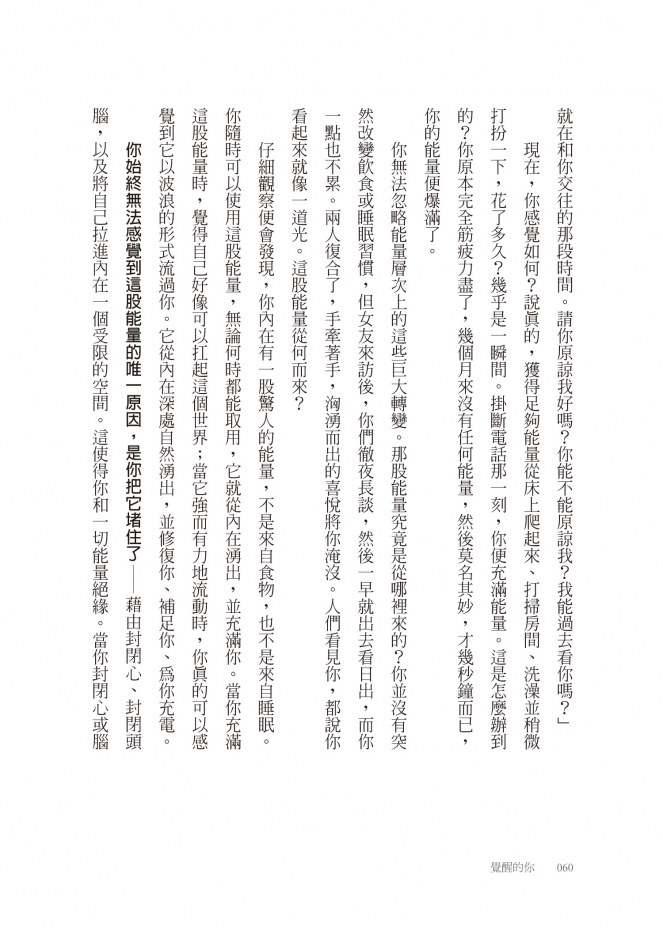 「若你釋放並讓能量通過,它就會消失。當痛苦在心中出現時,假如你放鬆並真的敢於面對,它就會過去。每一次你放鬆、放下時,就會有一小片痛苦永遠離開。」如同麥克.辛格所言,你要做的,就只是釋放,讓曾經糾結過你的痛苦通過你,讓騷亂的能量自由來去,只要察覺你正在做什麼就好。你抓得愈緊、愈執著,甚至築一道牆壓抑自己,反而把自己凍結在裡面。