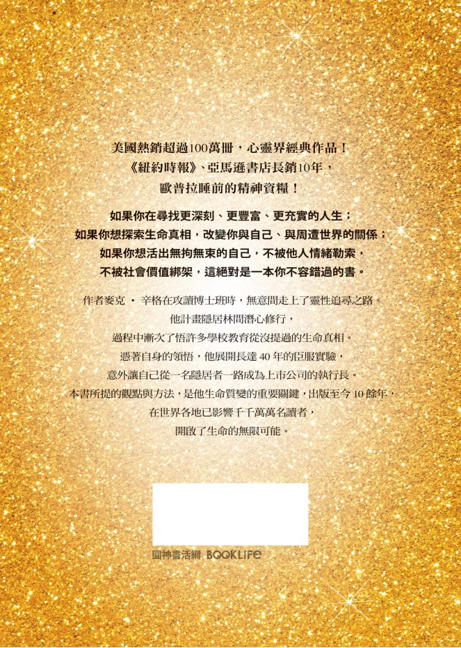「一拿起這本書、進入第一章,我就愛不釋手,已經不知道跟多少人分享過了。作者麥克‧辛格可以幫助你找到更大的內在平靜。我要告訴任何一個正在尋找更深刻、更豐富、更充實人生的人,這本書是份禮物。我已經把它送給每個我認識的人了。」